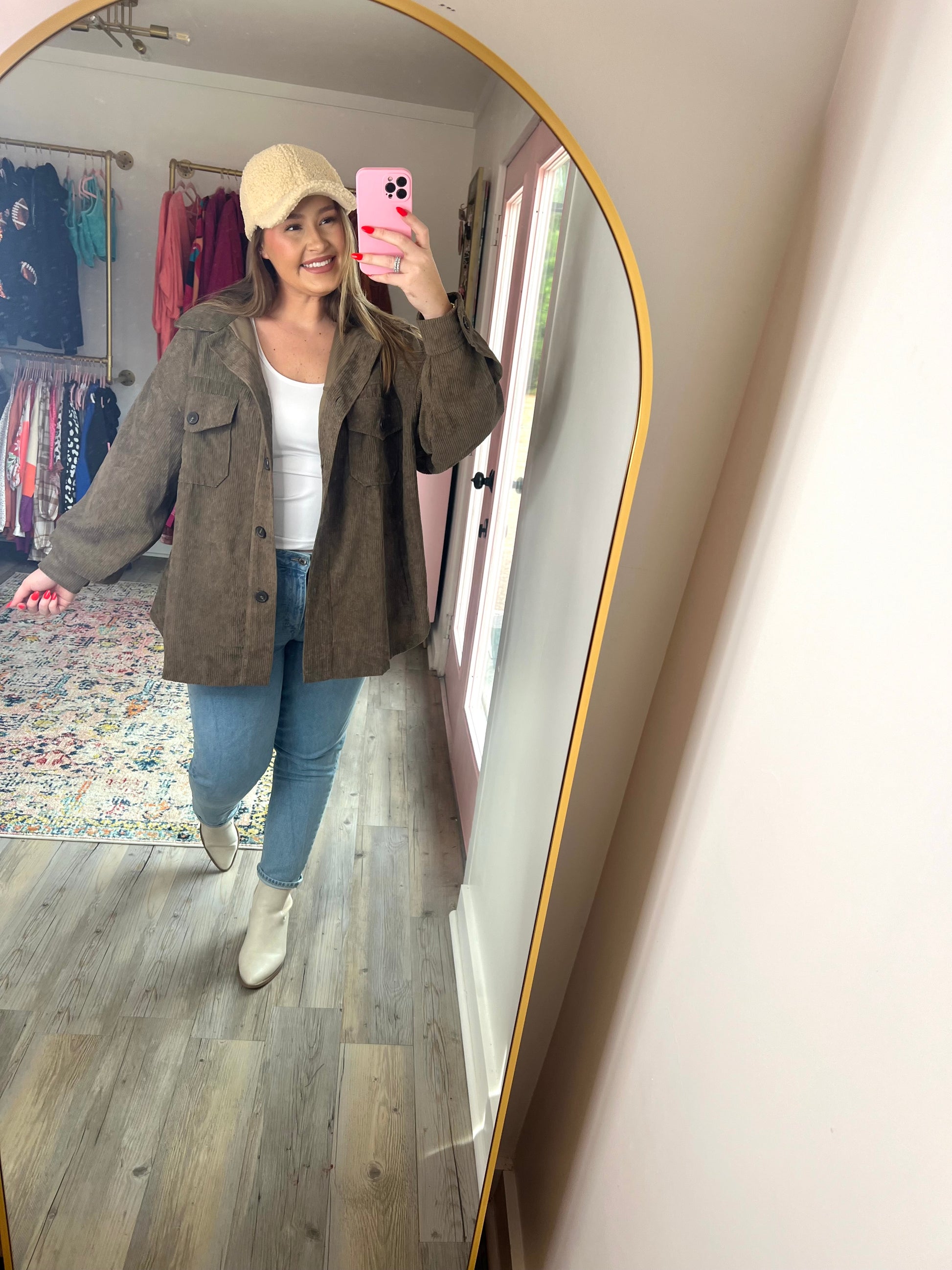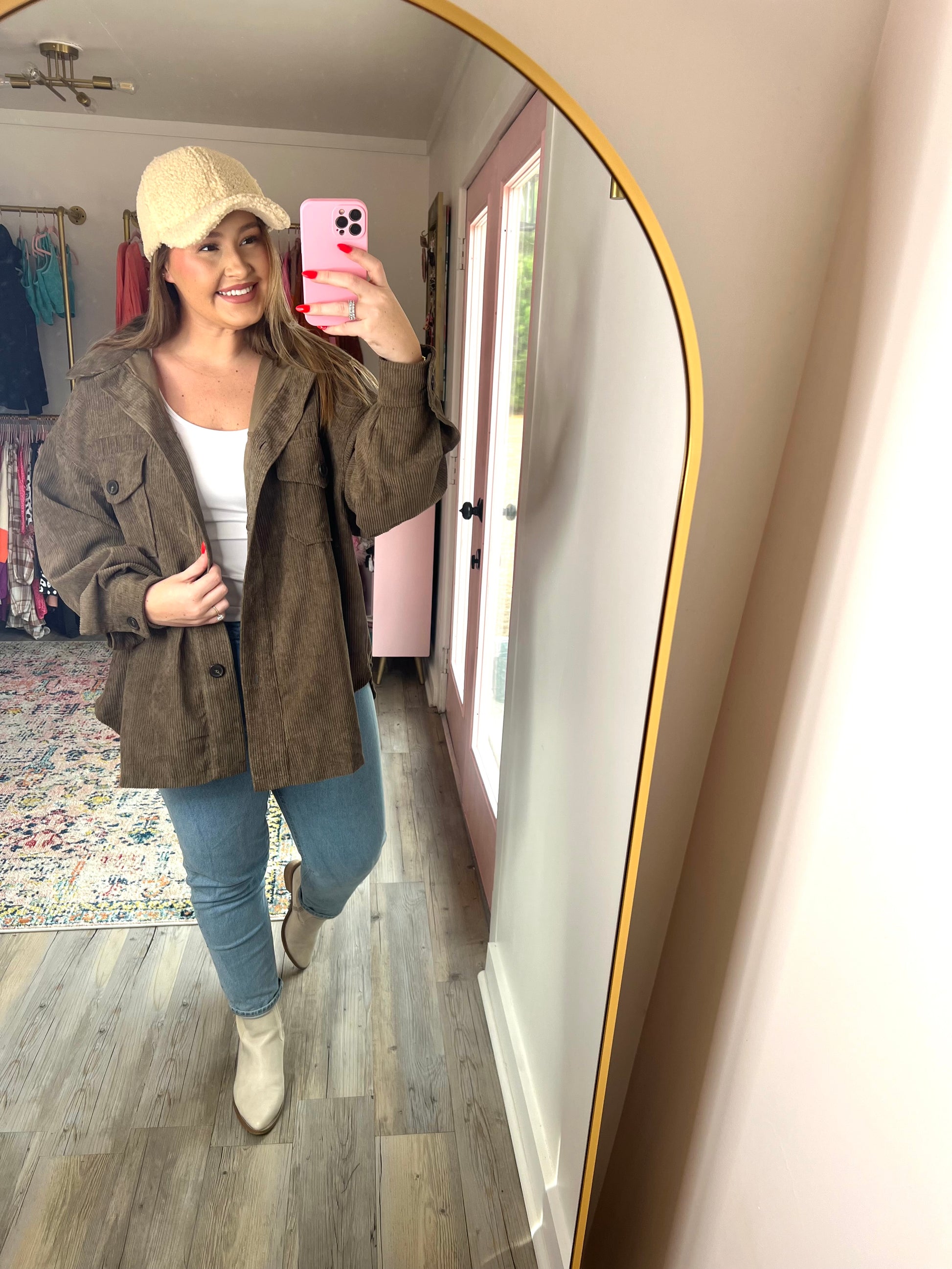 Introducing the Olive Colored Corduroy Shacket, your oversized go-to for chilly days! Perfectly oversized and oh-so-cozy, this shacket is a must-have for your wardrobe. Enjoy the warmth and style of corduroy without having to wear a coat! Get comfy and look good.