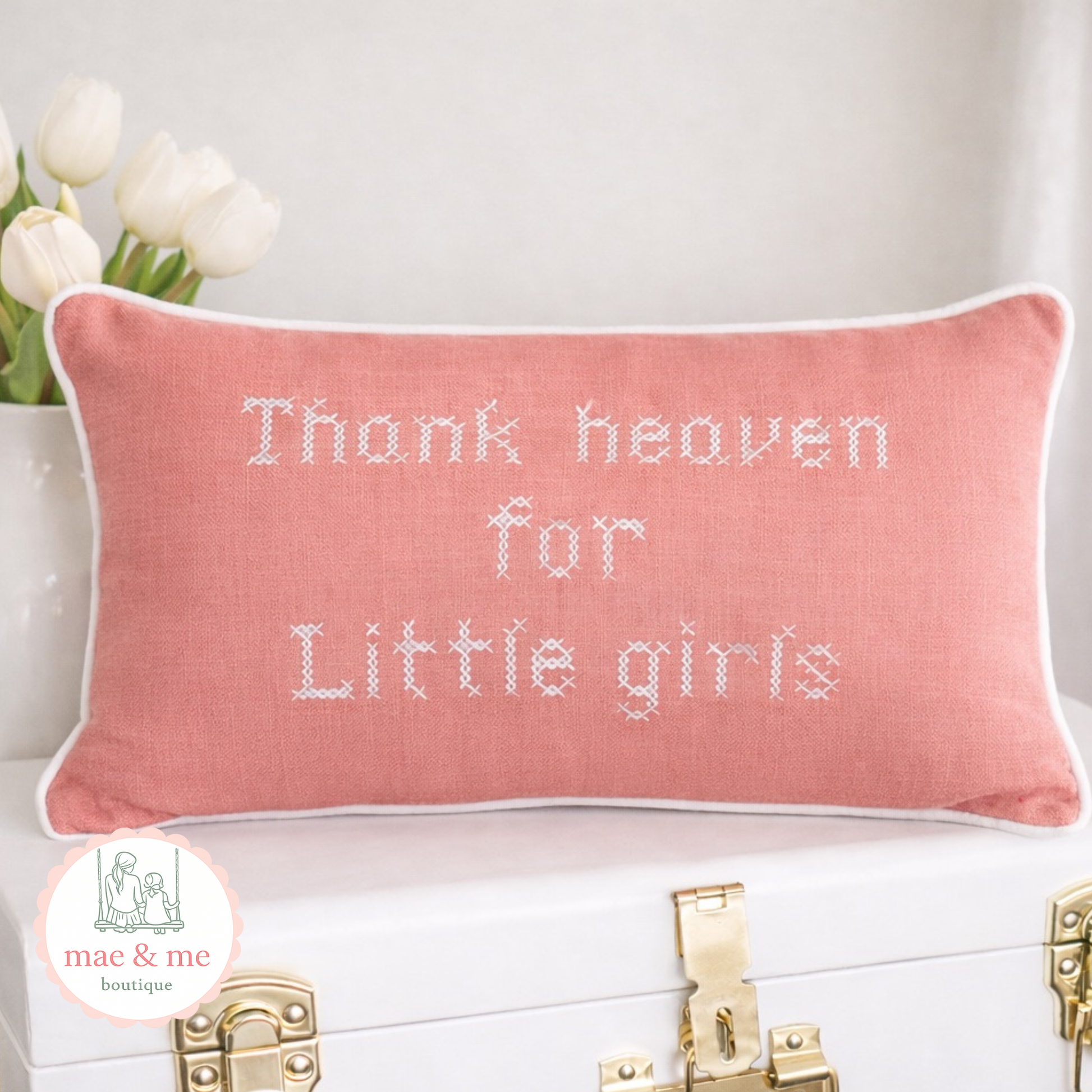 The Thank Heaven for Little Girls Pillow is an heirloom-quality piece designed to be cherished for generations. Its thoughtful craftsmanship ensures a lasting memory, making it a perfect gift for celebrating the joy of little girls in your life. 18x12 inches